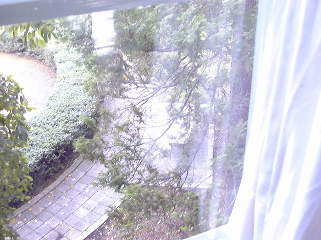 小石たちが座っていた中庭のベンチを激写(プ ・・・カーテンが映り込んでしまって良く見えませんけどね(汗)