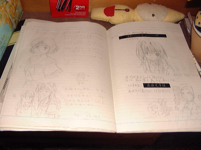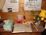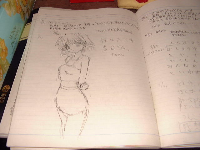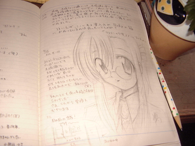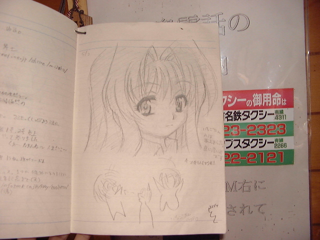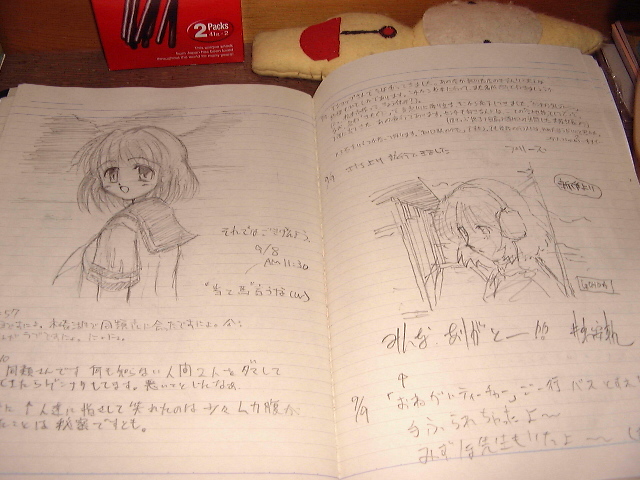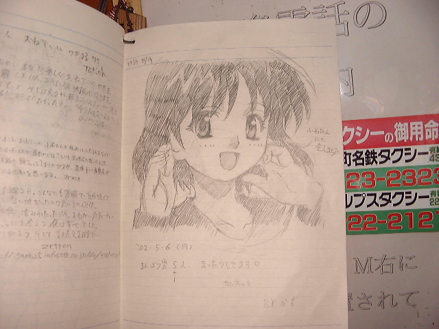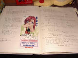 駅の待合室に設置されている旅のノートです。全部で3冊ありました。みずほ先生が好きなチョコレート菓子の箱や[まりえ]のぬいぐるみとか置いてあって、如何ともし難い気が利いたアクセサリーだなぁ、と(^^;;